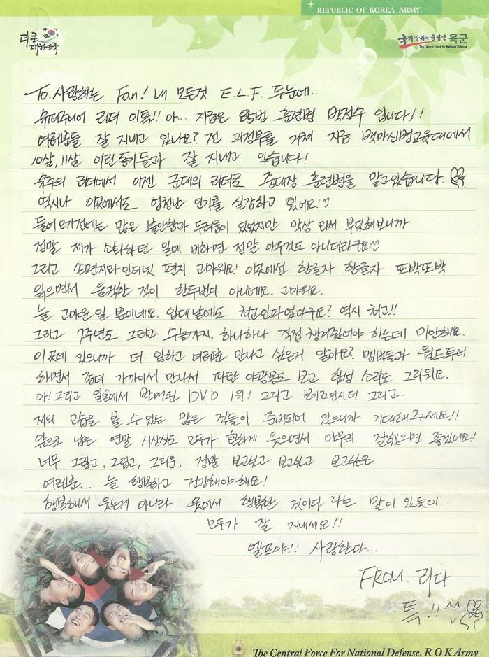 I am Super Junior's Leeteuk!! Ah...now(,) I am soldier-in-training number 85(,) Park Jungsoo!! Has everyone been well? I passed from Uijeongbu and is now doing well with brothers that are 10, 11 years younger than me at Baekmashin training centre. From suju's leader to now(,) taking on a role as a company leader soldier in the army. As expected(,) even at this place(,) I can feel the huge popularity!^-^ I had a lot of uneasiness and fear before coming in here but now that it's actually happening(,) it feels like its nothing and also(,) thank you for the hand-written and internet letters! While reading the letters word by words clearly(,) its not once or twice that I had strong feelings. Thank you. Its something that I am always thankful for. Even the day when I enlisted(,) there was a awesome crowd. As expected(,) the best!! And also(,) from the 7th anniversary to the College Scholastic Ability exams. I am sorry that I couldn't take care of those one by one personally. Do you know that the more I work(,) the more I want to meet you all? I miss doing the world tour with our members and being able to see the blue lightsticks and hearing the cheering sounds. Ah! and also(,) the DVD that is selling in Japan is number one! and also(,) boys in city. To the people awaiting to see my image(,) I am preparing so please anticipate!! The end of year award ceremonies that are left(,) It would be good if everyone can smile brightly and end it well! Really miss you and miss you and miss you and really want to see you see you see you everyone...you have to be happy and healthy! Like it has been said that you don't smile because you are happy but because smiling is a happy thing.. Everyone(,) be well!! E.L.F-ya!! I love you...